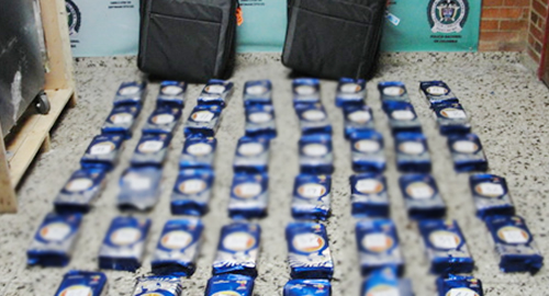 A través del servicio de control antinarcóticos a equipajes en el muelle internacional del aeropuerto El Dorado, personal uniformado integrante de la Dirección de Antinarcóticos de la Policía Nacional, lograron la incautación de 45 kilos de clorhidrato de cocaína modalidad doble fondo, ocultos en dos equipajes de bodega registrados a nombre de un ciudadano de nacionalidad italiana, quien pretendía viajar en la ruta Bogotá, Amsterdam – Holanda destino final Paris – Francia.Mediante procedimientos de registro y control en este terminal aéreo fueron inspeccionados dos (02) equipajes de bodega en lona color gris, los cuales contenían cuarenta y seis (46) paquetes rectangulares envueltos en bolsas de supuesto café, con una sustancia pulverulenta color blanco, que al realizarle la Prueba de Identificación Preliminar Homologada PIPH, arrojó resultado positivo para clorhidrato de cocaína, con un peso 45 kilos. El empleo de pasantes de drogas o correos humanos con sustancias estupefacientes a diferentes destinos internacionales por medio del aeropuerto internacional El Dorado, por parte de las organizaciones narcotraficantes, demuestran que el empleo de la modalidad de ocultamiento "doble fondo" es cada vez más recurrente en este terminal aéreo. Con esta incautación se afecta de manera directa las finanzas y las estructuras de las organizaciones narcotraficantes, ya que estableciendo el modus operandi, la ubicación geográfica del desarrollo de las actividades ilícitas y la identificación de algunos de sus integrantes, servirá como antecedente para las labores investigativas de la Policía Nacional en la lucha contra el narcotráfico.El capturado de nacionalidad Italiana y la sustancia estupefaciente incautada fue puesta a disposición de autoridad competente.La sustancia incautada tiene un valor aproximado a los 2.6 millones de dólares en territorio Europeo, evitando la comercialización de 112.500 dosis del estupefaciente en el narcomenudeo.
