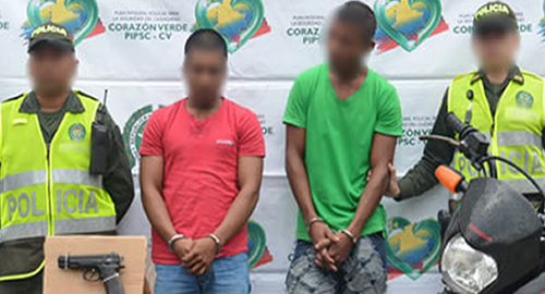 En desarrollo del Plan Integral para la seguridad ciudadana y plan choque contra el Hurto, unidades adscritas a la Estación de Policía Mocoa, lograron en las últimas horas la captura en flagrancia de dos presuntos delincuentes dedicados al hurto de motocicletas en el departamento del Putumayo.Estas personas además estarían involucrados en los delitos de Fabricación, Tráfico y Porte de Armas de fuego y Municiones, Hurto Calificado, Receptación, Lesiones Personales y Violencia Intrafamiliar. Estos hombres de 25 y 28 años de edad, al realizárseles el respectivo registro se les encontró en su poder una pistola y una motocicleta sin placas la cual había sido hurtada en el municipio de Orito (Putumayo).Tras investigaciones por parte de la policía se pudo establecer que estos sujetos tenían casa por cárcel por los delitos de porte ilegal de armas de fuego y violencia intrafamiliar.Los presuntos delincuentes, el arma de fuego y la motocicleta recuperada fueron dejados a disposición de las autoridades competentes.