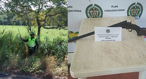 Las labores orientadas a contribuir a la Convivencia y Seguridad Rural, lideradas por el Departamento de Policía Meta, lograron sobre la vía que comunica a la cabecera municipal de San Martín con la Vereda Merey el hallazgo de una escopeta, calibre 12, de fabricación artesanal, con la cual al parecer se pretendía realizar un hecho delictivos en ese sector.Los uniformados que realizaron el procedimiento, a la distancia observaron a dos sujetos abandonar un elemento y huir por un potrero hacia una zona boscosa, al llegar al lugar, encontraron el arma de fuego entre un matorral al lado de la vía.Arma de fuego, será objeto de pruebas técnicas de balística, para establecer su posible participación en hechos delictivos, para lo cual fue dejada a disposición de la Fiscalía competente.