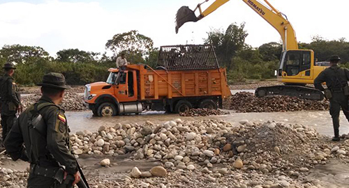 En desarrollo de las labores del plan choque "Vamos Seguros Meta" contra la minería ilegal, el Escuadrón Móvil de Carabineros emprendió la tarea de verificar uno a uno, la legalidad de los yacimientos mineros, que se encuentran ubicados a lo largo y ancho en los 23 municipios que hacen parte de la jurisdicción del Departamento de Policía Meta.Este tipo de controles a las empresas que realizan la explotación de material de arrastre contribuyen a la protección de los recursos naturales y a la disminución del impacto ambiental.