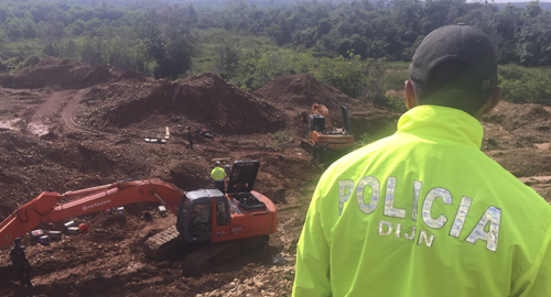 Nuestros uniformados adscritos a la Dirección de Investigación Criminal e Interpol en cumplimiento a la Estrategia contra la Minería Ilegal EIMIL, adelantaron las primeras ocupaciones del país con fines de extinción de dominio sobre cuatro bienes inmuebles ubicados en el municipio de Cáceres, Antioquia, los cuales eran utilizados como instrumento para la comisión de delitos ambientales.Los hechos que propiciaron la ocupación de los bienes se remontan al pasado 24 de marzo de 2012 cuando en una operación de interdicción nuestros uniformados adscritos a la Dirección de Carabineros y Seguridad Rural, intervinieron dos minas ilegales utilizadas para la explotación ilícita de yacimiento minero que ocasionaba contaminación de los recursos naturales en una zona de reserva del rio Cauca. En el allanamiento fueron capturadas 13 personas, entre ellas uno de los propietarios de los inmuebles utilizados para la actividad minera.Posteriormente, nuestros investigadores de la DIJIN continúaron la investigación para identificar los bienes de los responsables de la afectación al medio ambiente y los predios utilizados para la comisión de este ilícito.De acuerdo con el proceso investigativo los puntos de explotación fueron movidos dentro de los grandes predios para no ser detectados por las autoridades y así seguir con el aprovechamiento ilícito de yacimientos mineros.La investigación continúa con miras a establecer la conexión que existe entre estas minas ilegales y el pago de cuotas a integrantes del 'clan narcotraficante Úsuga' que hace presencia en esta zona del bajo cauca antioqueño.Los cuatro bienes inmuebles que fueron utilizados para este ilícito, avaluados aproximadamente en $116.189.304.000 fueron ocupados y cobijados con medidas cautelares de embargo, secuestro y suspensión del poder dispositivo.