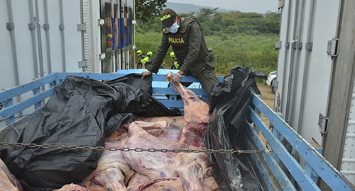 Cerca de 140 millones de pesos representados en más de siete toneladas de carne bovina, fueron decomisados por nuestros uniformados como resultado de los procedimientos de control aduanero que de forma constante se ejercen en la frontera binacional.En total, fueron 7.421 kilogramos de carne en canal y vísceras procedentes del vecino país de Venezuela los que eran transportados en vehículos particulares en condiciones de ilegalidad y evidente estado de insalubridad. Los procedimientos de incautación fueron realizados por nuestro personal de la Policía Fiscal y Aduanera en el marco de las acciones institucionales para enfrentar el contrabando y comercio ilícito transnacional en la zona de frontera colombo - venezolana.Es importante que las personas adquieran este tipo de productos alimenticios en lugares que garanticen su calidad, contando con la cadena de frío reglamentada para su conservación y el protocolo de manipulación y almacenamiento necesario que impida su contaminación con agentes externos.Las mercancías fueron dejadas a disposición de la Dirección de Impuestos y Aduanas Nacionales (DIAN).