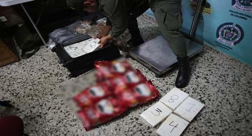 Personal uniformado adscrito a la Dirección de Antinarcóticos de la Policía Nacional a través de controles técnicos y humanos en el aeropuerto Internacional El Dorado, logró la captura de una ciudadana colombiana cuando pretendía abordar un avión con destino a Panamá, llevando consigo dos equipajes de mano con 26 kilos de clorhidrato de cocaína.Al momento de hacer el abordaje despertó sospecha teniendo en cuenta que de su equipaje se desprendía un fuerte olor a mentol, al proceder a realizar una inspección al contenido de las maletas, se encontró una sustancia sometida a la prueba pericial PIPH que permitió determinar que era clorhidrato de cocaína.El alcaloide iba oculto en bolsas de café, impregnada con mentol, medicamento usado para curar luxaciones y contusiones.La persona capturada y la sustancia incautada fueron dejadas a disposición de autoridad competente.