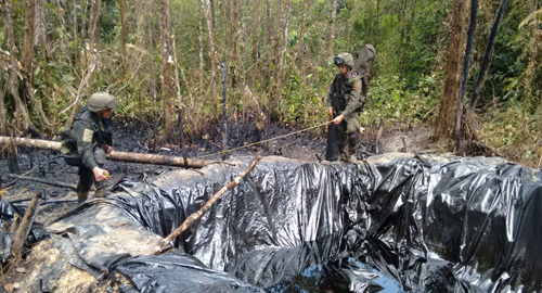 Nuestros uniformados adscritos al Grupo de Operaciones Especiales de Hidrocarburos, mediante operativos contra el hurto de combustible del Oleoducto Trasandino, logran destruir cuatro nuevas refinerías ilegales de crudo en zona rural de Tumaco.Luego de que nuestros policías realizarán patrullajes rurales por las veredas El Yuyero, Pianulpi, La Marranera y La Viña del municipio de Tumaco, se logra la ubicación y posterior destrucción de cuatro complejos ilícitos para tratar el hidrocarburo, en donde habían 11 piscinas artesanales en cuyo interior se encontraron 60.5473 galones de crudo.Es de anotar que en uno de los sitios fueron erradicadas dos hectáreas de coca con aproximadamente 22.000 matas. Estos elementos son usados por los grupos al margen de la ley que delinquen en la Costa Pacífica Nariñense, para el procesamiento de la base de coca y otras actividades ilícitas. Asimismo, los actos ilegales, crean un gran impacto negativo ecológico debido a que el crudo es vertido en un afluente hídrico, afectando la salud de los habitantes del sector y los animales que son nativos del lugar.Continuaremos con los operativos, que contribuyan a la ubicación de las refinerías ilegales de combustible, y la incautación de hidrocarburos extraídos ilegalmente del oleoducto Trasandino, que afecta de gran manera la economía de la región, contaminando nuestro ecosistema, destruyendo de manera considerable los recursos naturales y fuentes hídricas.