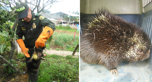 En una reserva forestal en el corregimiento del Encano, la Policía Metropolitana San Juan de Pasto, encontró un puerco espín que estuvo a punto de perecer pero con la ayuda de personal uniformado pudo seguir coexistiendo con las demás especies a la ribera de la cocha.Este pequeño roedor que habita en los páramos al parecer se había extraviado, adentrándose muy cerca de las casas aledañas a la vereda el Puerto, en el Encano. Su peripecia lo dejó atorado en un matorral, cuando sus púas se enredaron, impidiéndole cualquier tipo de movimiento.La comunidad del sector decidió llamar a la Policía Ambiental quien en poco tiempo y con la experiencia del caso, salvó al animal de su difícil situación.Luego de una minuciosa revisión por personal especializado y constatando que no presentaba heridas que ameriten su retención transitoria en un albergue animal, fue devuelto a su hábitat natural.