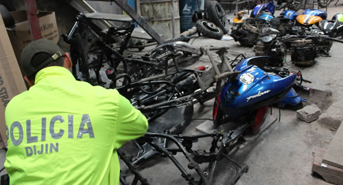 Mediante el Plan de Choque contra el delito, estrategia gubernamental para reducir los índices de inseguridad en el país, la DIJÍN desmanteló en el sector de Mártires, en Bogotá, un desguazadero de motos y logró la captura de una persona.El falso taller estaba camuflado en una zona céntrica donde abundan los establecimientos dedicados a la compra, venta y arreglo de motocicletas por lo que pasaba inadvertido ante las autoridades.Pero una vez verificada la actividad comercial del local, los investigadores de la DIJIN establecieron que allí realmente se dedicaban a desguazar, comercializar y distribuir repuestos de motocicletas hurtadas mediante las modalidades de halado e intimidación por el uso de armas de fuego.Esta organización dedicada al hurto de motocicletas, desguace y comercialización de sus partes, delinquía en Bogotá; los vehículos eran hurtados en las localidades de Kennedy, Bosa y Fontibón. Luego eran trasladadas a estos locales comerciales donde en horas nocturnas una o dos personas se encargaban de desarmar sus partes susceptibles de cambio y comercialización, procediendo a borrar y a picar las autopartes que contienen los sistemas de identificación tales como motor y chasis; en horas de la mañana eran vendidas y distribuidas en los diferentes locales del sector de autopartes. Las autopartes hurtadas eran adulteradas mediante el sistema de regrabado; bajo el proceso de reactivación química de motores y chasis se logró la identificación de cuatro motocicletas, la cuales presentan noticias criminales por el delito de hurto, hechos delictivos presentados en diferentes localidades de la ciudad de Bogotá.La acción policial permitió la captura de un hombre que registra antecedentes judiciales por los delitos homicidio, receptación y concierto para delinquir.