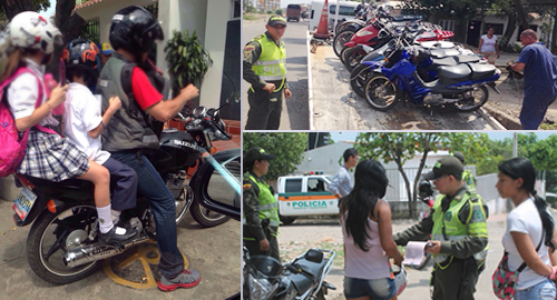 30 comparendos económicos fueron expedidos en la primera jornada del 2015, por diferentes infracciones al tránsito.La Policía Metropolitana de Cúcuta a través de la Seccional de Tránsito y Transporte activó los controles sancionatorios a quienes en motocicletas transporten a menores de diez años e incurran en otras infracciones al tránsito, garantizando con ello la seguridad en el transporte escolar y al tiempo vigilar el respeto de las normas viales vigentes.Luego de varias semanas de realizar acercamientos con la comunidad con campañas pedagógicas e informativas, socializando la reglamentación que prohíbe transportar niños y niñas menores de diez años en motocicleta entre otras disposiciones.En tal virtud las unidades de la Seccional de Tránsito y Transporte llegaron en inmediaciones de un establecimiento educativo del barrio La Libertad, para verificar que los padres de familia y personas encargadas del transporte escolar de los estudiantes cumplieran con la normatividad que regula este tipo de transporte. La respuesta no fue la esperada y en total se impartieron 30 comparendos a conductores que fueron sancionados por incurrir en infracciones como no portar casco, llevar sobrecupo, transportar menores de 10 años, no portar licencia de conducción, seguro obligatorio de accidentes de tránsito y revisión técnico mecánica. Por su parte a 25 de los conductores le fueron inmovilizadas las motocicletas.Más allá de la sanción económica a la que se hicieron acreedores, los transportadores fueron llamados a no continuar transportando a niños y niñas menores de diez años de edad en su motocicleta, en muchos de los casos además sin cumplir con las medidas de protección necesarias para evitar resultar lesionados ante un evento improvisto o accidente de tránsito.