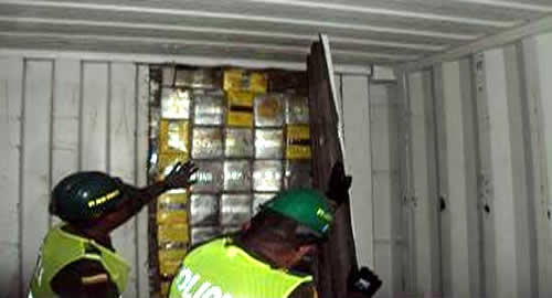 Personal adscrito a la compañía de control portuario de la Dirección de Antinarcóticos se incautaron de 145 kilos de clorhidrato de cocaína en uno de los terminales de carga en este puerto marítimo, ocultos en la estructura metálica de un contenedor que sería embarcado con destino a la República de Guatemala. Durante el desarrollo de un operativo de registro y control a la plataforma de aforos de este puerto marítimo, los uniformados se percataron de alteraciones en la estructura metálica interna de un contenedor que transportaba materiales para construcción, lo que motivó a realizar el registro detallado del interior del mismo, determinando inconsistencias en varias de sus paredes para lo cual se perforó una de la paredes observando en la broca del taladro, la presencia de una sustancia con características similares a estupefaciente, al realizar la remoción de la lámina se hallaron 146 paquetes rectangulares forrados en plástico que al practicárseles la prueba de identificación preliminar homologada PIPH, arrojó resultado positivo para clorhidrato de cocaína con un peso de 145 kilos. La sustancia estupefaciente hallada al parecer tendría un valor aproximado a los 6.6 millones de dólares en territorio centroamericano.En lo corrido del año 2015, la Policía Nacional ha incautado 109.5 toneladas de clorhidrato de cocaína en el territorio nacional.