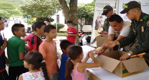 Con el propósito de desestimular la violencia y promover comunidades seguras y en paz, la Policía lideró en este municipio la estrategia "Plan Desarme", invitando a la niñez y la adolescencia a hacer entrega de juguetes bélicos y armas blancas.A esta actividad se vincularon alrededor de 90 niños, niñas y adolescentes, siendo una oportunidad propicia para afianzar los vínculos y estrechar los lazos de amistad, expresando la voluntad institucional en contribuir al sano crecimiento de la niñez.Durante la jornada, fueron entregados 75 juguetes bélicos y 15 armas blancas, elementos que fueron recepcionados por uniformados y un delegado de la Alcaldía Municipal; a cambio, cada infante recibió un pollito, como insignia por su compromiso.De igual forma, se realizaron actividades lúdicas y recreativas, llevando un día lleno de alegría y juegos a esta importante población del Departamento.
