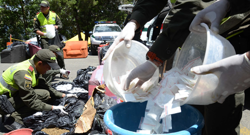 Según las investigaciones al parecer este cargamento de alucinógenos perteneciría a la banda delincuencial "la terraza", que ha venido cometiendo diferentes actividades delictivas en el sector como la extorsión, hurto a motocicletas y microtráfico.La Policía Nacional de Colombia a través de la Metropolitana del Valle de Aburrá en el marco del programa presidencial "seguridad ciudadana, política nacional para la prosperidad democrática" y en desarrollo de la estratégia de seguridad y convivencia ciudadana, logró la incautarse de gran cantidad de aluciongenos que al parecer eran fuente de financiación de la banda delincuencial conocida como "la terraza" la cual delinque en la comuna nororiental de Medellín.El procedimiento policial se realizó al interior de una vivienda ubicada en el barrio San Blas, comuna nororiental de Medellín, a partir de la reacción de las patrullas adcritas al Modelo Nacional de Vigilacia Comunitaria por Cuandrantes, ingresaron a una vivienda abandonada, en la cual hallaron los siguentes elementos:Siete (07) costales en fibra 350 kilos de marihuana; 900 gramos de bazuco; 700 gramos de base de coca; 3.300 gramos de cocaína; 6363 cigarrillos de marihuana equivalentes a 1.600 gramos; dos (02) grameras; una (1) picadora artesanal.