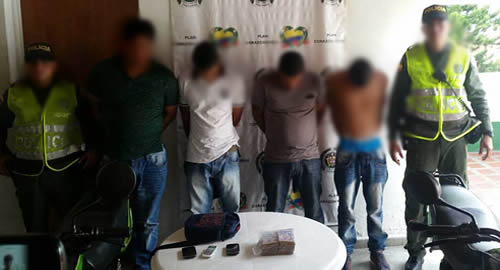 Una oportuna llamada de la comunidad permitió la reacción inmediata de los cuadrantes cercanos a una vivienda ubica en la calle 70, lugar donde ingresaron sujetos intimidando a los propietarios con arma de fuego para hurtar aproximadamente 35 millones de pesos, joyas y enseres por cinco millones más.A los hombres con edades entre los 22 y 32 años de edad, se les incautaron cuatro celulares, un arma de fuego, seis cartuchos sin permiso para porte o tenencia. Además se les inmovilizó tres motocicletas. Estos ciudadanos fueron dejados a disposición de la autoridad judicial competente por los presuntos delitos de hurto calificado, porte ilegal de armas y secuestro simple, junto con el arma de fuego, os celulares incautados y los vehículos inmovilizados.