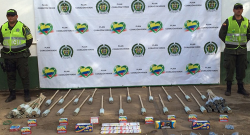En desarrollo de labores del plan choque "Vamos Seguros Meta", sobre el kilómetro 108+00 de la vía que conduce hacia el municipio de Puerto Gaitán, personal de la Seccional de Tránsito y Transportes realizó la incautación de 14 mil gramos de pólvora negra representada en fuegos pirotécnicos, que era transportada en dos vehículos de servicio particular, exponiendo la integridad de sus ocupantes y de los usuarios del eje vial.Este material explosivo fue hallado en dos procedimientos: en el primero, a un hombre de 38 años de edad se le hallaron 120 voladores y 48 martillos; seguidamente, a un hombre de 46 años de edad se le hallan 72 voladores y 48 mechas.Los fuegos pirotécnicos avaluados en aproximadamente 750 mil pesos, quedaron a disposición de la Inspección de Policía del municipio de Puerto Gaitán.