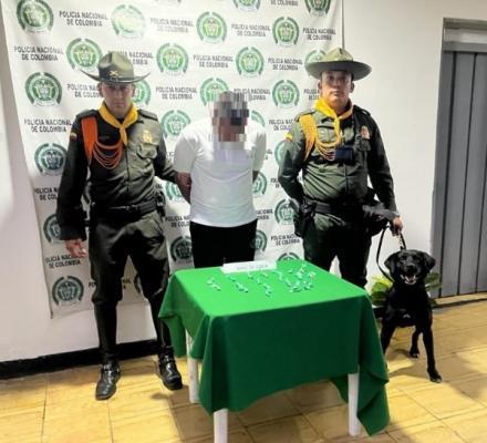 El hecho se presentó en la Subestación Pantanillo cuando uniformados requieren a un ciudadano para un registro a persona y gracias a la eficacia del canino ‘Maxi’, se le halla en sus pertenencias 20 dosis de cocaína.