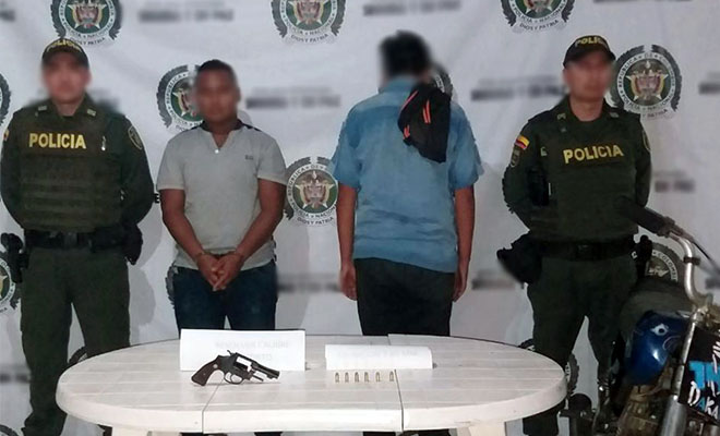 Los indiciados, un hombre de 24 años de edad y un adolescente de 16 años de edad, quienes se movilizaban en una motocicleta portando un revólver calibre 32 y seis cartuchos para el mismo, sin permiso para porte o tenencia, los cuales fueron dejados a disposición de la Fiscalía 39 seccional de esa municipalidad, por el delito fabricación, tráfico y porte de armas.