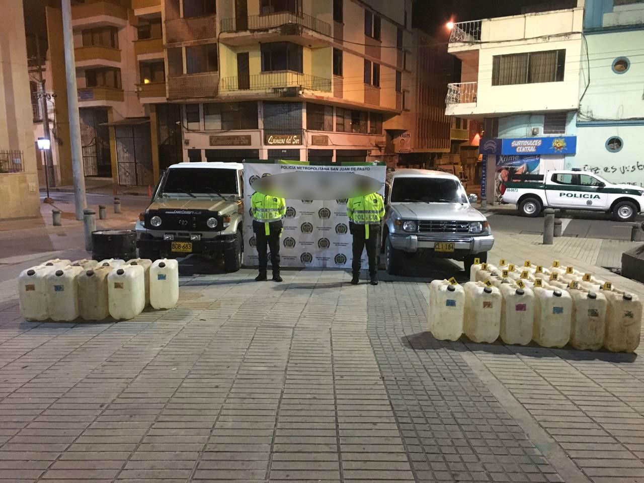 El efectivo despliegue de nuestras unidades y en desarrollo de operaciones contra el narcotráfico, uniformados pertenecientes a la Policía Metropolitana San Juan de Pasto logran incautar más de 200 millones de pesos en acetona; capturando a dos hombres vinculados al delito de tráfico de sustancias utilizadas para el procesamiento de narcóticos.
