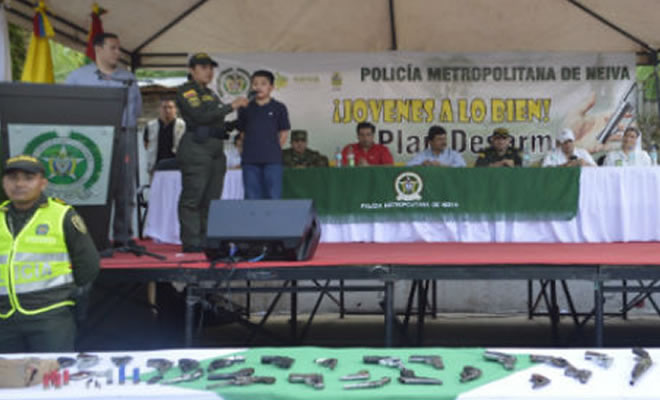 Es así como el pasado 08 de octubre en el polideportivo del Barrio Guillermo Liévano de la Comuna Ocho, más de 80 jóvenes de diferentes zonas de la ciudad con quienes se viene realizando un importante trabajo como ejemplo de reconciliación y superación entregaron sus armas (20) revólver, ocho (08) pistolas, dos (02) changones artesanales, ocho (8) escopetas, dos armas de fogueo, siete (07) proveedores para pistola, dos (02) granadas de fragmentación, una(01) granada de aturdimiento, esto ante la presencia de autoridades departamentales, municipales y la comunidad asistente al denominado "Plan Desarme".