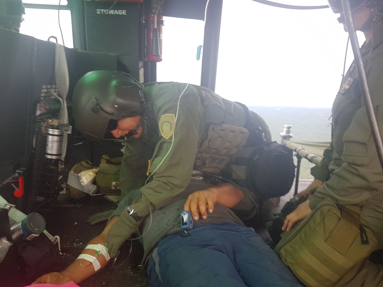 Inmediatamente es coordinada aeronave de primeros auxilios desde la Base de la Región siete de Antinarcóticos Helicóptero Huey II (PNC 0709), que efectuó el traslado de este ciudadano desde la zona rural hasta el municipio de San José del Guaviare.
