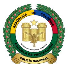 CARACTERÍSTICAS: El distintivo de la Escuela de Policía en Protección y Seguridad tendrá forma circular, en metal oro. Sobre este se dispondrá un círculo dividido en cuatro secciones, incorporando los colores de la Bandera Nacional. El amarillo, azul y rojo ocuparán la mitad superior del círculo, con la leyenda en sable: “REPÚBLICA DE COLOMBIA”.