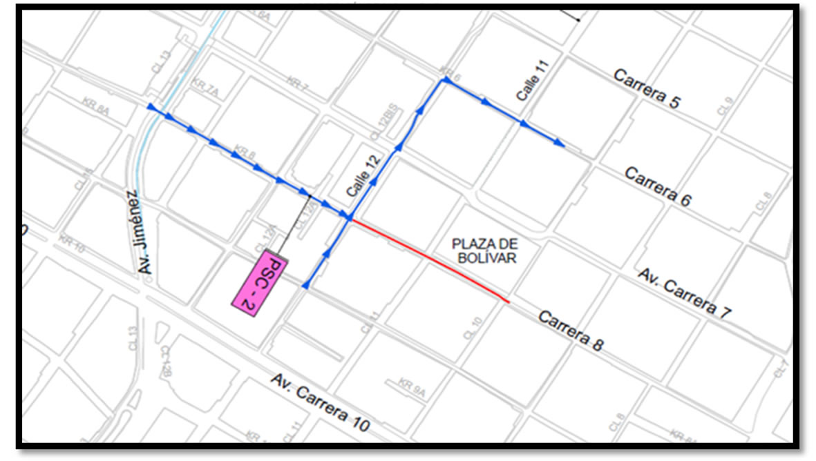 • Los usuarios que circulan en sentido Norte - Sur por la Carrera 8 deberán tomar la Calle 12 al Oriente - Carrera 6 al sur (Ver mapa 1).