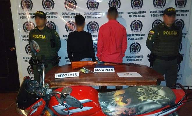 El primer caso, se dio en horas de la noche, en la vereda San Ignacio del municipio de Lejanías, en donde, en medio de una persecución e interceptación de una motocicleta, se logró la captura en flagrancia de dos sujetos de 18 y 20 años de edad, a quienes se les hallaron en su poder un revólver y una escopeta, ambos de fabricación artesanal y con ocho cartuchos para las mismas, sin permiso para porte o tenencia.