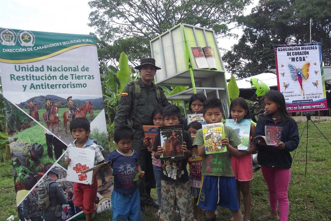 Policías pertenecientes a la Unidad de Restitución de Tierras y Antiterrorismo Eje Cafetero, que trabajan en las zonas rurales de esta región, evidenciaron las dificultades educativas y convirtieron su motocicleta en una biblioteca ambulante, Con ella como herramienta dictan talleres, comparten libros y realizan actividades culturales con los niños.