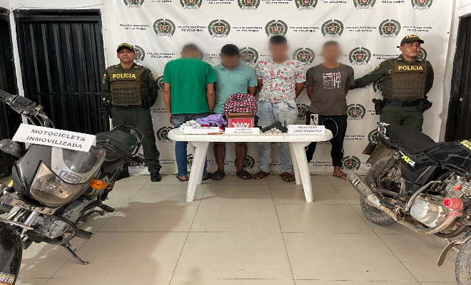El Banco, Magdalena. En la vía que comunica al municipio de El Banco con Chimichagua sector del corregimiento El Trébol, la Policía Nacional en una rápida y efectiva reacción, lograron capturar en flagrancia a cuatro delincuentes que se movilizaban en dos motos, los cuales habrían cometido un hurto a dos mujeres.